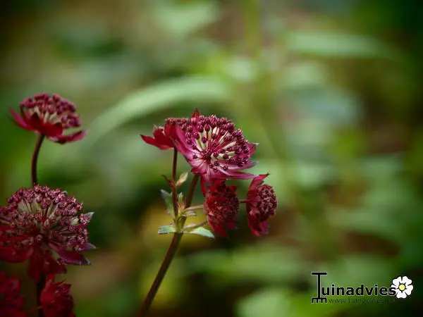 Die umbelförmigen Blüten haben eine sehr feine Struktur, Stängel, Blüten und Hochblätter sind tiefrot.