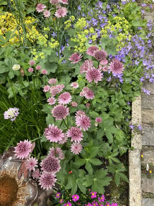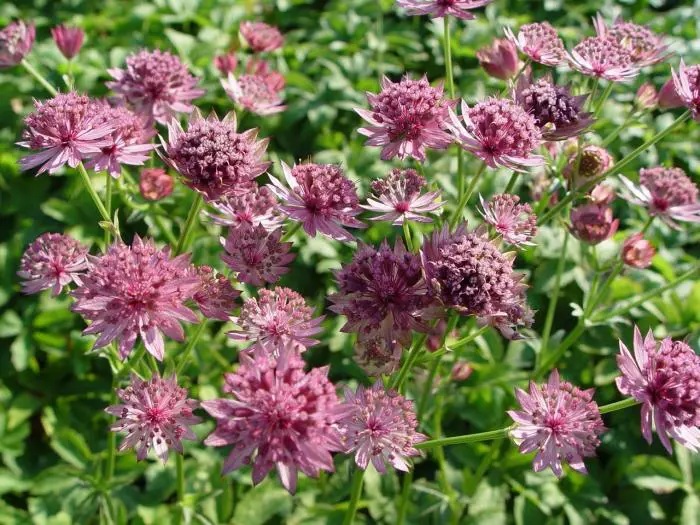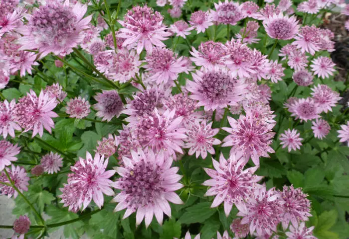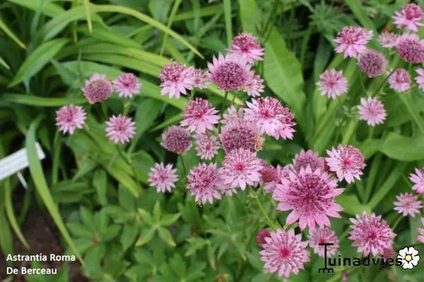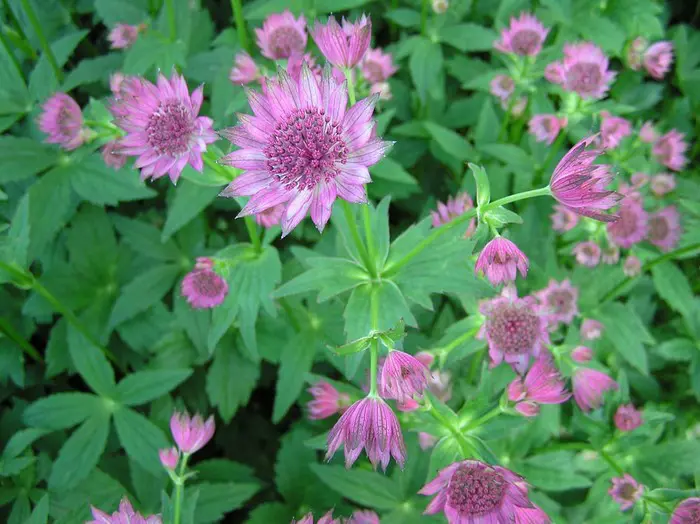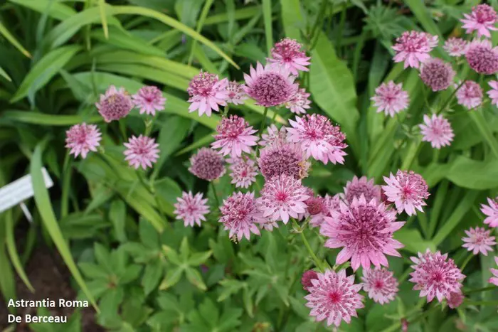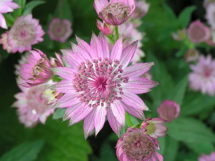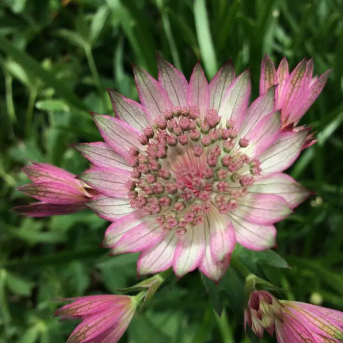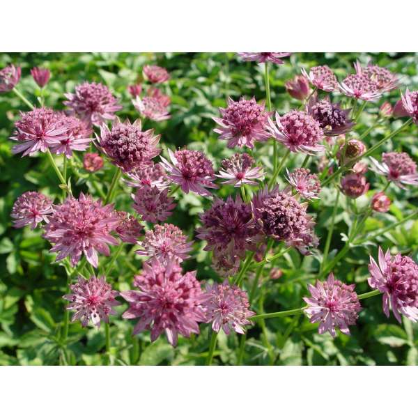 Astrantia major 'Roma' blüht mit wunderschönen, fein strukturierten Blüten in zwei Rosatönen, die Hochblätter sind blass, frisch rosa und umgeben ein kleines Herz aus leuchtendem Rosa.