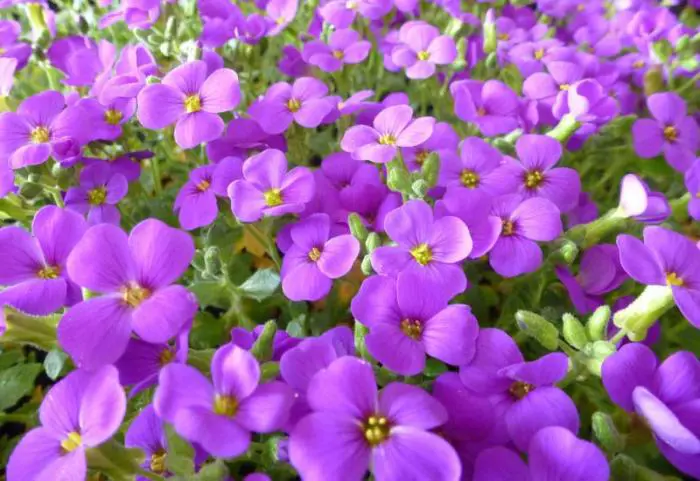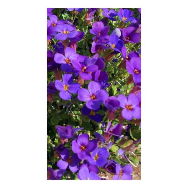 Aubrieta 'Hamburger Stadtpark' ist eine rasenbildende alpine Pflanze, die farbige Teppiche mit leuchtend violetten Blüten und einem kleinen gelben Herz bildet.
