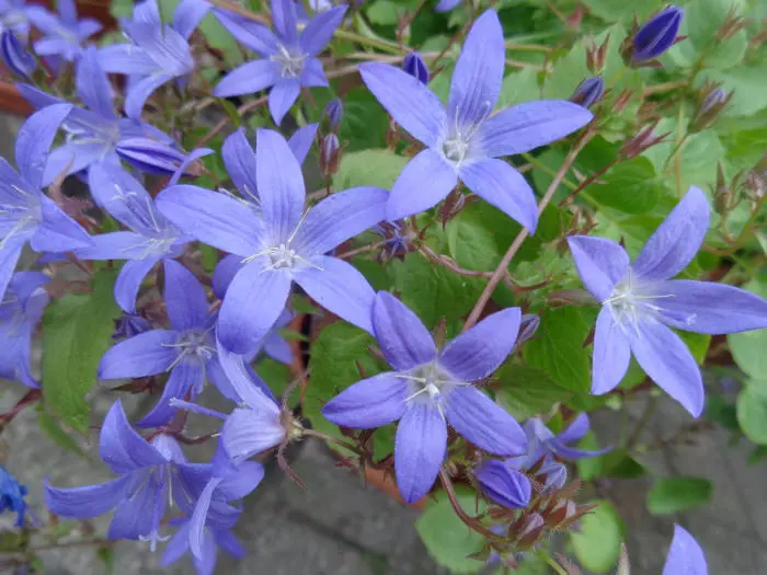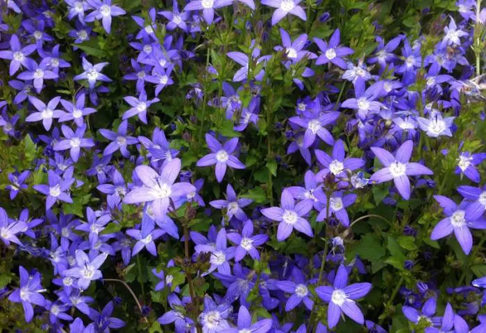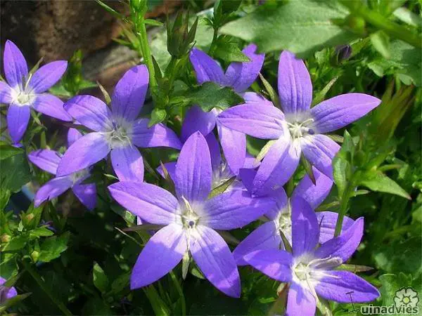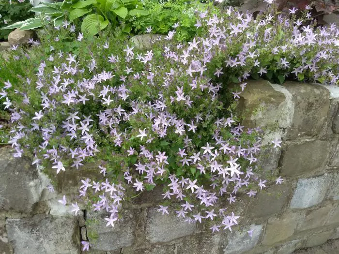Eine niedrige Campanula mit langen Stängeln, ideal zum Aufhängen an den Rändern von Töpfen, Behältern oder Wänden. Am Fuß einer Mauer gepflanzt, steigt er schnell leicht nach oben.