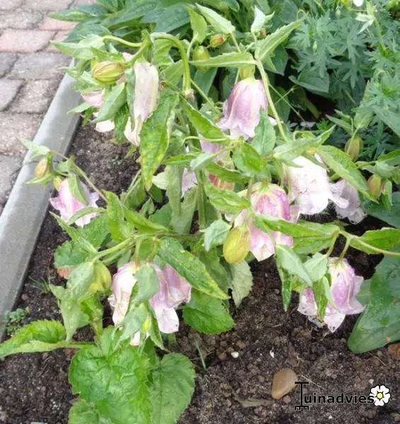 Eine Campanula punctata ist eine wunderschöne, buschige Sorte, die im Frühsommer sehr schöne halb-doppelte, glockenförmige, violett-rosa Blüten mit einem blassrosa Rand bildet.