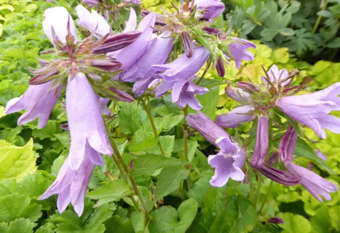 Campanula 'Viking' blüht an aufrechten Stängeln mit großen, lila-violetten Blüten aus violetten Knospen. Die trompetenförmigen Blüten können bis zu 6 cm groß werden. Aufwachsen.