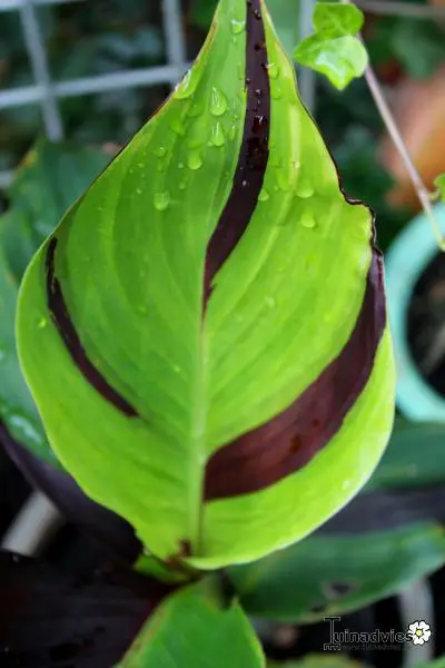 Die großen blau-grünen Blätter mit rot-bronzefarbenem Grün sind sehr auffällig und ähneln großen Bananenblättern.