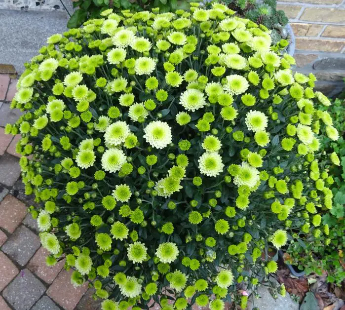 Chrysanthemum SANTINI 'Country' blüht mit kugelförmigen grau-grünen Blüten.