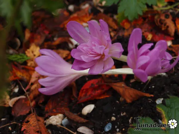 Colchicum 'Giant' blüht mit sehr großen, trichterförmigen lavendelrosa Blüten (8 cm) mit weißem Hals. Sie ist außerdem eine der größten Sorten (H.20 cm).