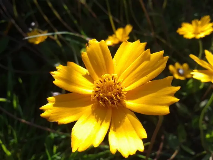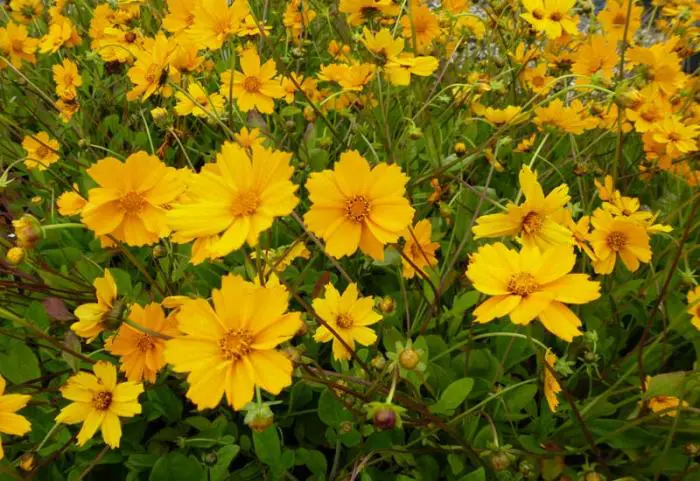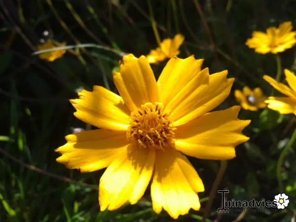Coreopsis auriculata 'Elfin Gold' ist eine kompakte, mehrjährige Pflanze mit breiten, ovalen, dunkelgrünen Blättern. Blüht an aufrechten Stängeln mit goldgelben Blütenköpfen.