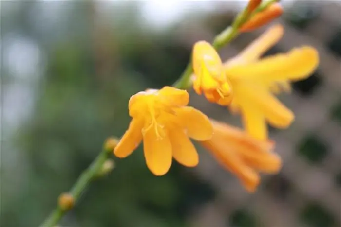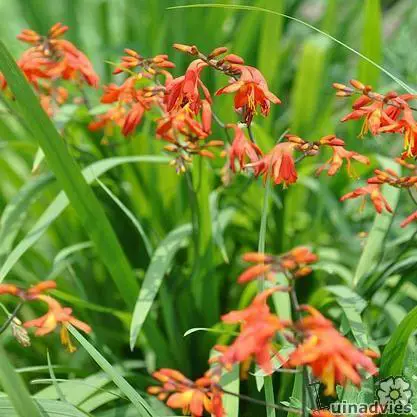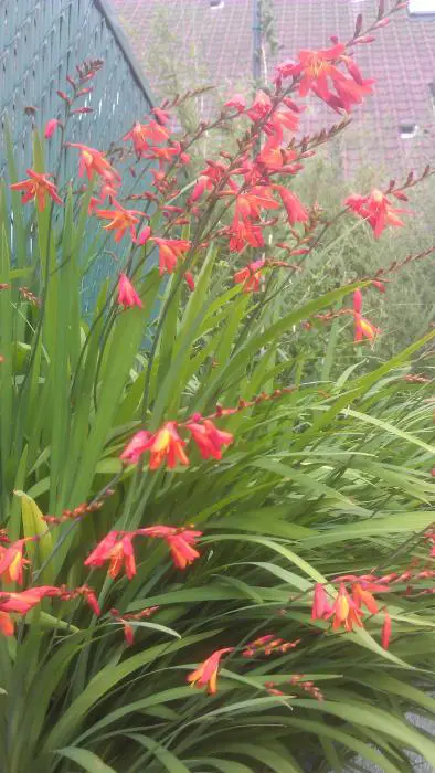 Crocosmia x crocosmiiflora ist ein echter Stern im Beet, den er mit seinen geschwungenen Stängeln entfacht, die mit orange-roten, trichterförmigen Blüten bedeckt sind. Die getrockneten Blumen riechen nach Safran.