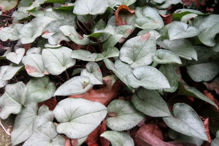 Die Blätter ähneln ein wenig denen von Efeu, sind herzförmig, dunkelgrün und silberweiß marmoriert, gestützt von langen Blattstielen, die direkt aus der Knolle kommen.