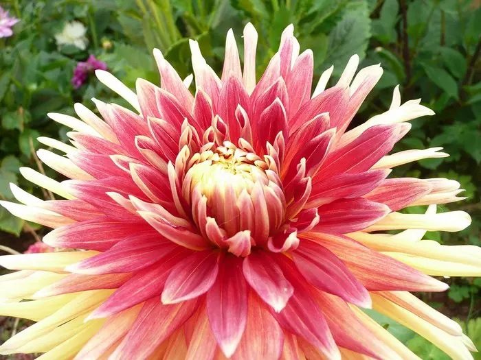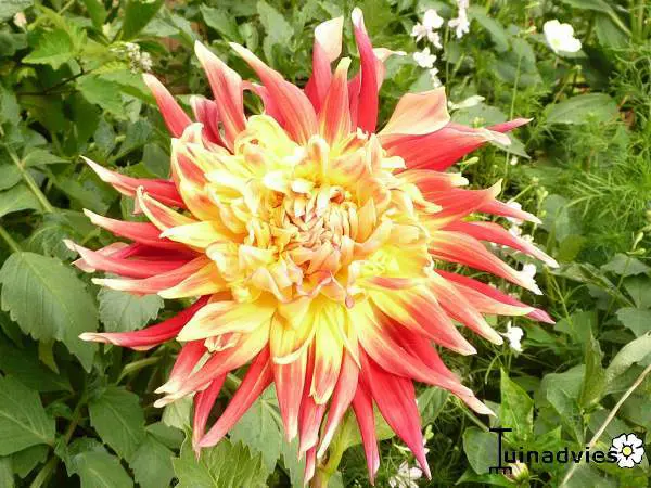 Die Dahlia 'Akita' ist eine dekorative Dahlie mit gut gefüllten großen Blüten und breiten, flachen, braun-rot/goldgelben Blütenblättern.