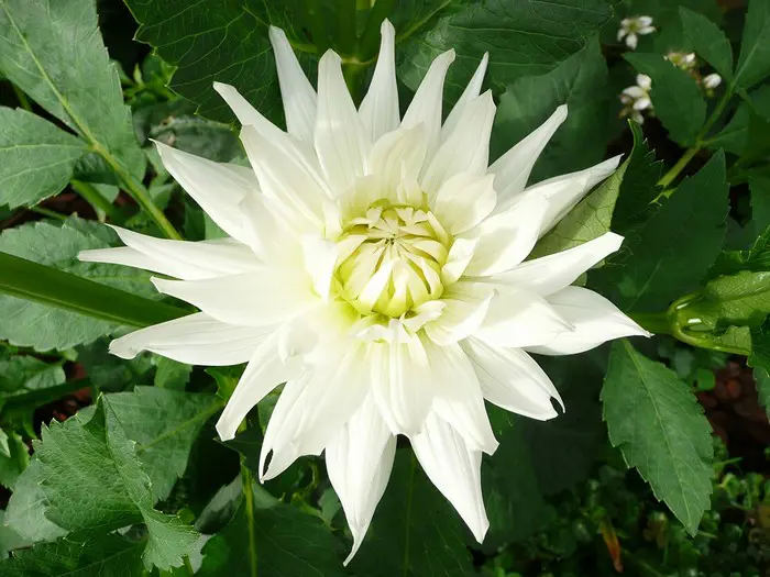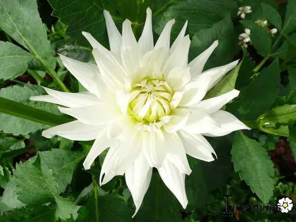 Dahlia 'My Love' ist eine Kaktus-Dahlie (Spinnenopdahlie) mit gut gefüllten, reinweißen Blüten und einem grünlich-gelben Zentrum. Die Blütenblätter sind fast vollständig zusammengerollt.