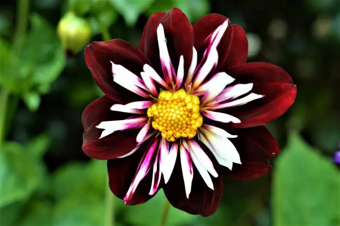 Dahlia 'Night Butterfly' ist eine Halskragen-Dahlie (Collerette). Die Blüten haben eine Reihe breiter, flacher schwarz-roter Strahlenblüten und um das gelbe Herz eine Reihe langer, weißer röhrenförmiger Blüten.