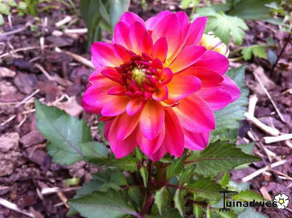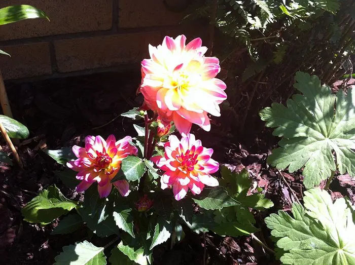 Dahlia 'Pink Butterfly' ist eine dekorative Dahlie. Die Blüten sind gut gefüllt mit breiten, flachen, weichen rosa Blütenblättern und cremegelb gestreiften Blütenblättern in der Mitte.