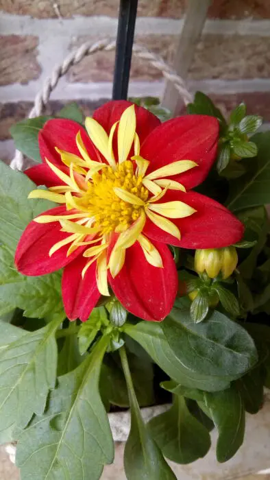 Dahlia 'Starsister Red-yellow' ist eine Halskragen-Dahlie (Collerette). Die Blüten haben eine Reihe breiter, flacher dunkelroter Strahlenblüten. Um das goldgelbe Herz herum eine Reihe kürzerer gelber Strahlenblüten.
