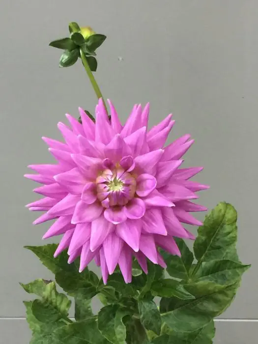 Die Dahlie 'Worton Blue Streak' ist ein Halbkaktus-Typ und blüht mit gut gefüllten, fliederfarbenen Blüten, wobei die Blütenblätter teilweise aufgerollt sind.