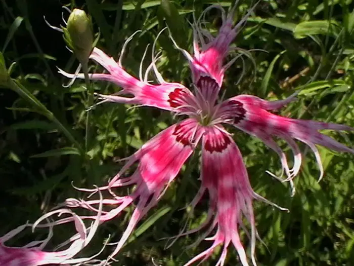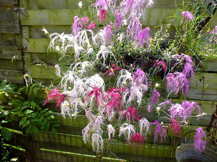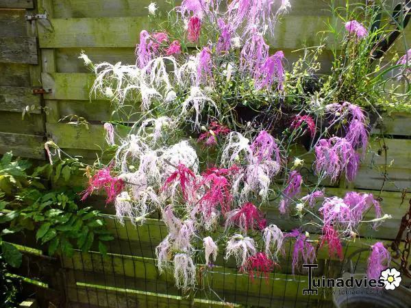 Hat grasige, grau-grüne Blätter und blüht an langen, feinen Stängeln mit duftenden, weißen, magentafarbenen oder violetten Blüten und ungewöhnlichen, langen Fransen.