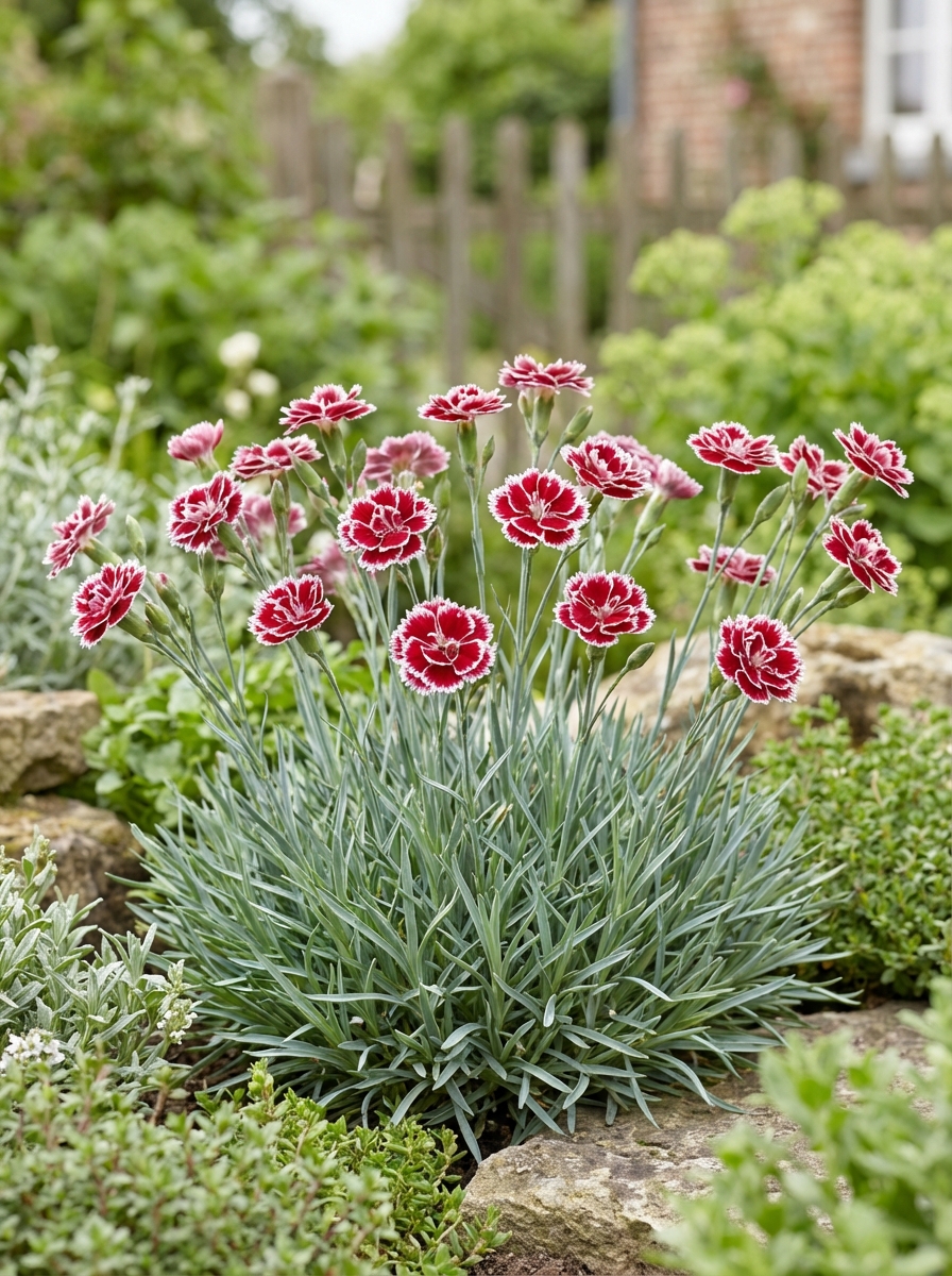 Blüht vom späten Frühling bis zum Sommer mit steifen, aufrechten Stängeln und nelkenduftenden, halbdoppelten Blüten in einer weißen und weinroten Farbe.