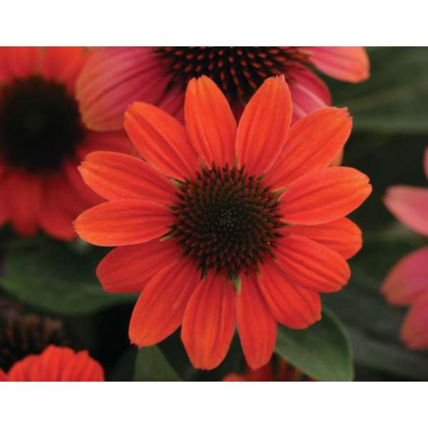 E. 'SOMBRERO Hot Coral' blüht orange/korallenfarben mit einem rötlich-braunen Zapfen.