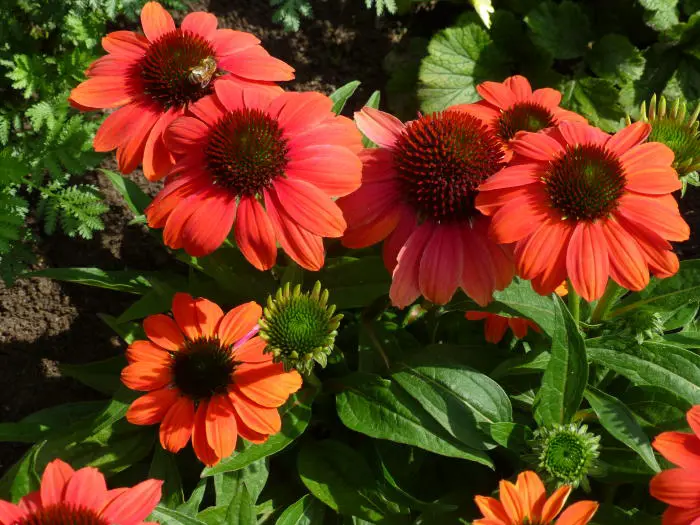 Echinacea purpurea 'SOMBRERO Hot Coral' ist ein rotes Sonnenhat aus der SOMBRERO-Serie. Dies sind gut verzweigte, robuste, kompakte Pflanzen mit großen Blüten.