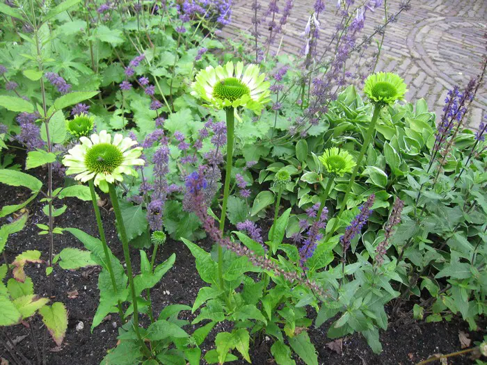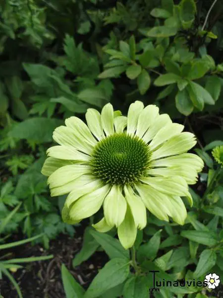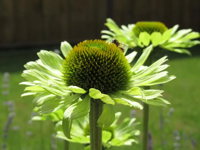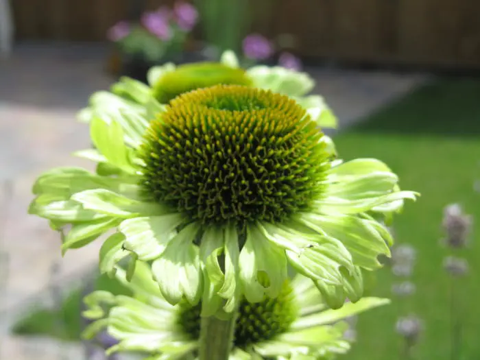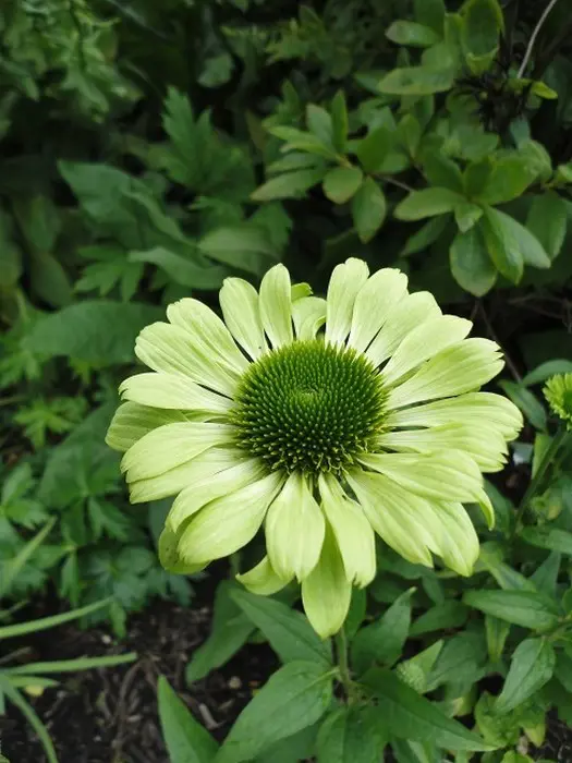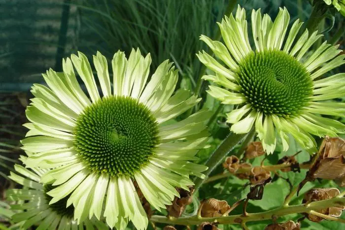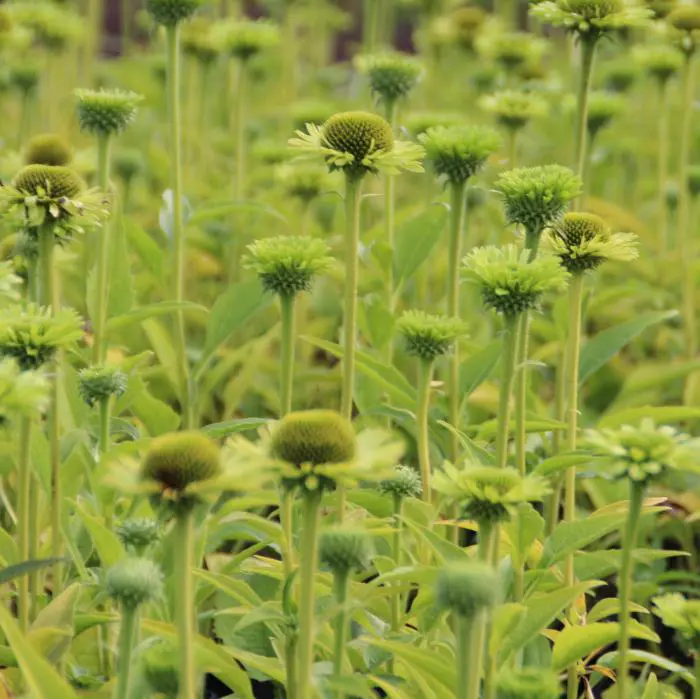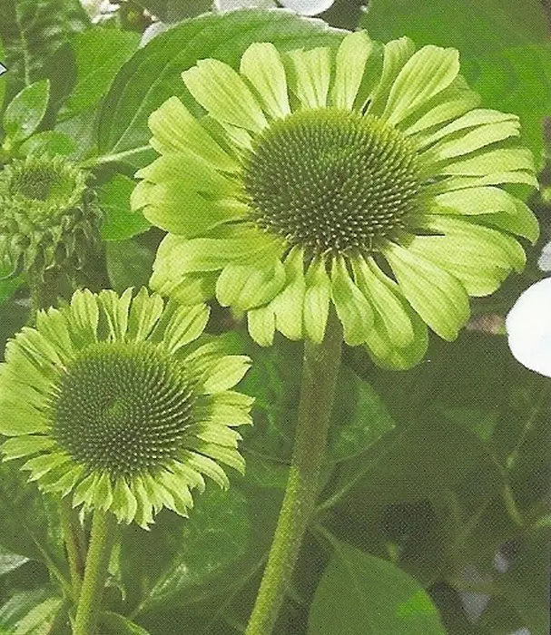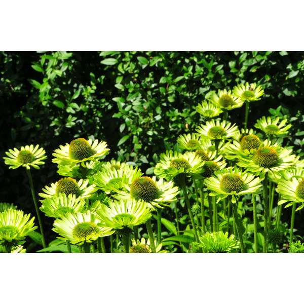 Echinacea 'Green Jewel' blüht üppig an kräftigen Stängeln mit großen, hellgrünen bis limonengrünen Blütenblättern um einen dunkelgrünen Zapfen, der später einen purpur-orangefarbenen Schimmer annimmt.