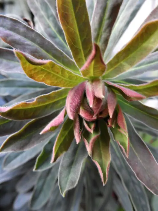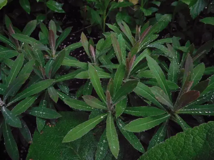 Lanceolate Blätter sprießen leuchtend rötlich-violett und werden dann allmählich bronzegrün.
