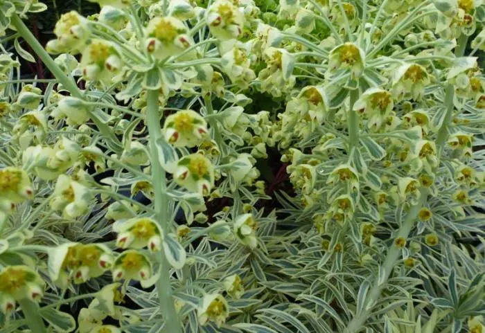Euphorbia characias subsp. wulfenii 'Emmer Green' hat einen auffälligen grünlich-gelben Blütenstand an dicken rosa Stängeln. Es ist auch sehr dekorativ wegen der linearen cremefarbenen/grünen Blätter.