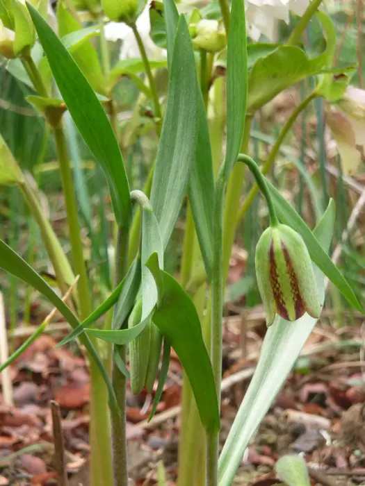 Die nickenden, glockenförmigen Blumen sind smaragdgrün mit braun-rot und innen wunderschön mit einem hellen Rautenmuster markiert.