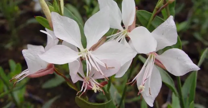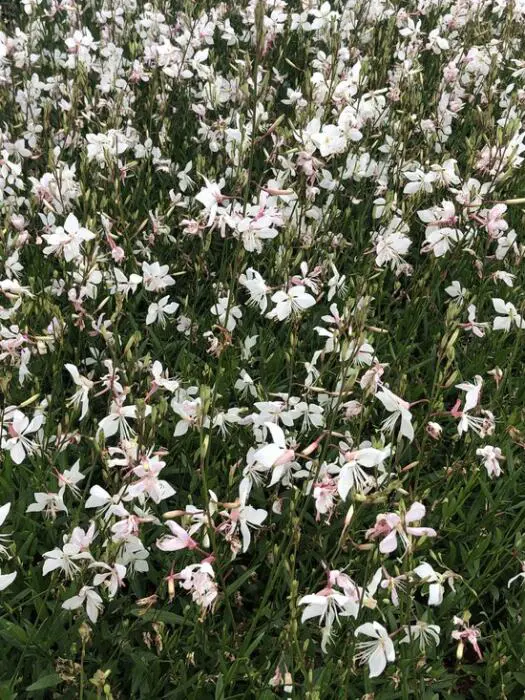 Gaura lindheimeri 'Short form' ist eine kurzlebige, buschige, kompakte Pflanze mit einer langen Blütezeit mit weißen, schmetterlingsähnlichen Blüten aus hellrosa Knospen. Blühen auf langen, feinen Stängeln, die im Wind wiegen.