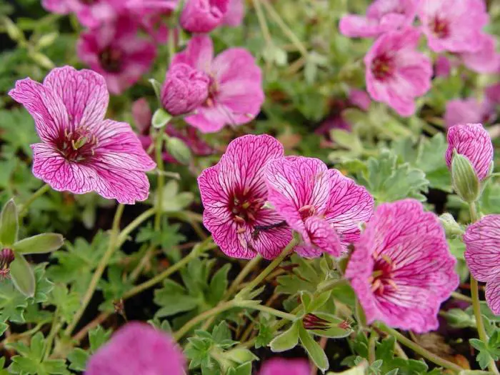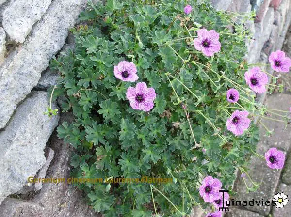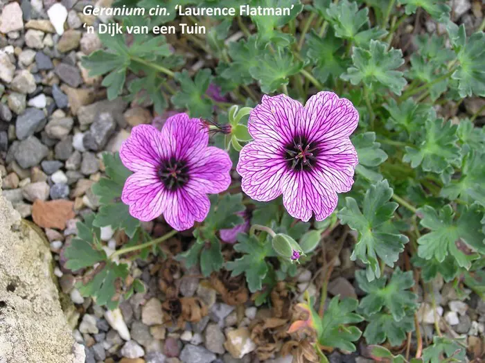 Geranium cinereum 'Laurence Flatman' ist eine Zwergenart mit sehr geteilten, weichen Blättern und langer Blüte. Sehr ähnlich wie G. 'Ballerina', hat aber größere Blüten, ist hell lavendelrosa mit auffälligen violetten Adern und dunklem Herz.