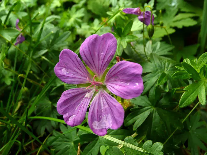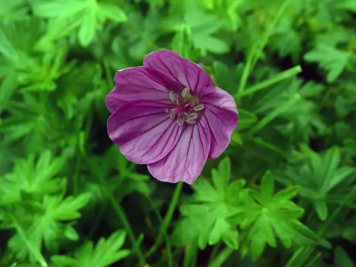Geranium cinereum ist eine Zwergenart mit sehr geteilten, weichen Blättern und langer Blüte.
