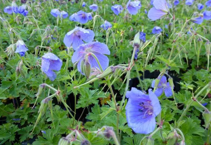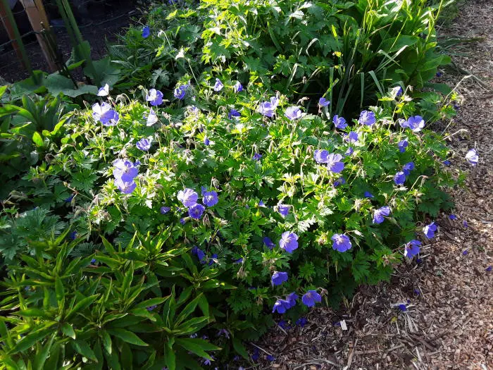 Geranium himalayense ist ein ausgezeichneter Bodendecker mit violett-blauen Blüten und einem rosa-weißen Zentrum im Sommer.