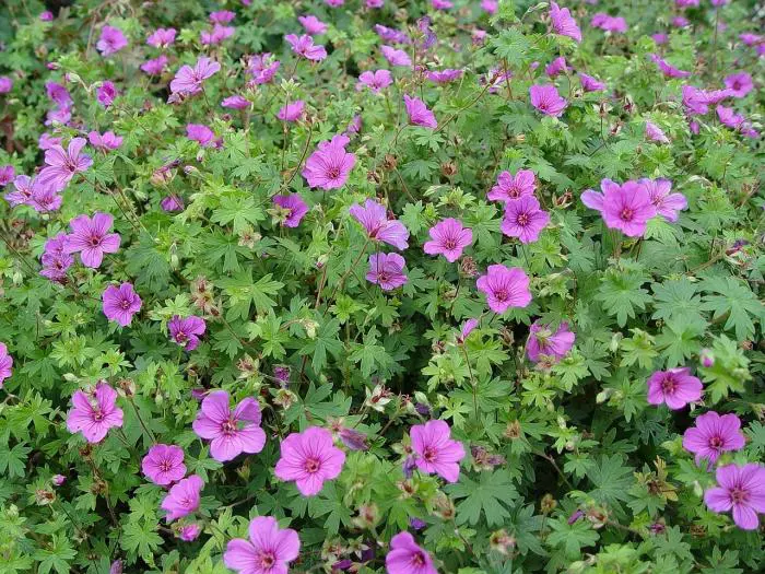 Geranium 'Dilys' ist ein langblütiger Kranichvogel, dessen violett gestreifte, fuchsia-rosa Blüten im Sommer zu Beerenrot werden. Die Blüten sind in der Mitte etwas dunkler.