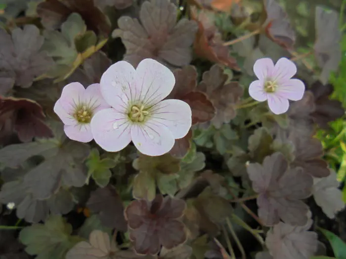 Perlmuttrosa Blüten bilden einen wunderschönen Kontrast zu den dunklen bronzenen bis schokoladenbraunen Blättern, die mit Grün gemischt sind.
