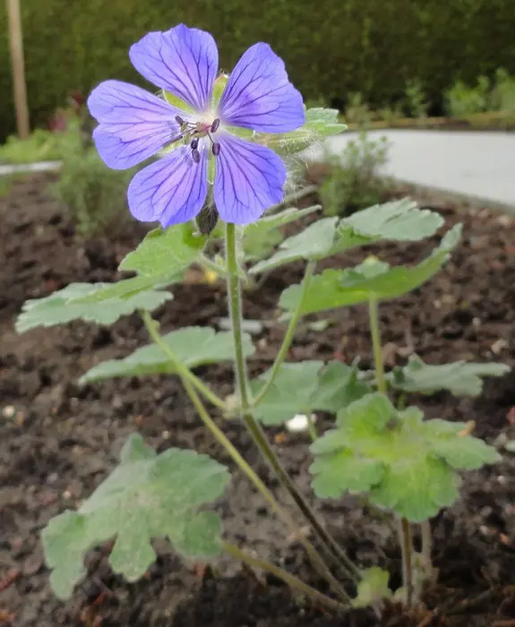 Geranium renardii 'Vapelle' ist eine Geranie, die auch ohne Blüte recht gut sein kann, mit schönen, ordentlichen immergrünen, sehr flaumigen grau-blauen Blättern.