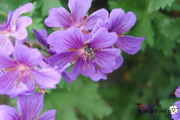 Blüht üppig mit dunkelädern, violett-violetten Blüten, die in der Mitte etwas röter sind.