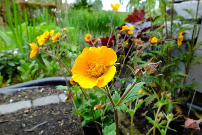 Geum 'Carlskaer' blüht mit becherförmigen orange-gelben Blüten, in der Mitte dunkler.