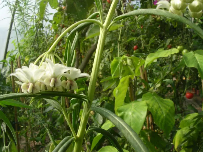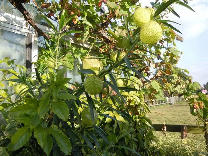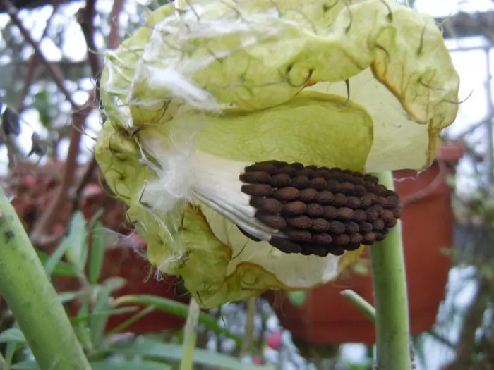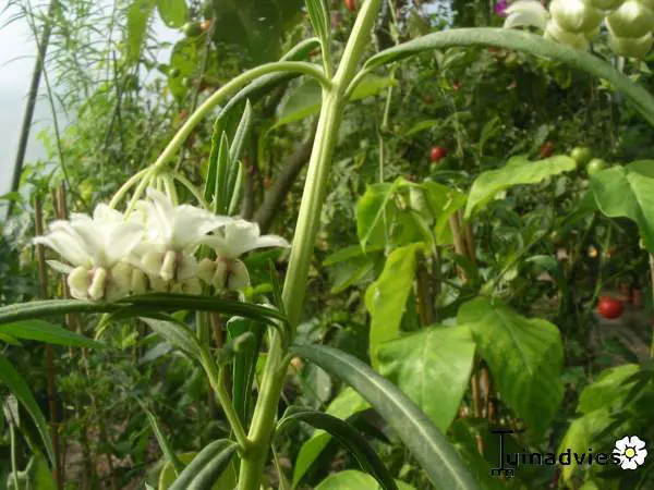 Gomphocarpus physocarpus blüht mit weißen Blüten, die später zu grünen/bräunlich-grünen, behaarten Blasenfrüchten heranwachsen, aus denen der seidige Samenfluff hervorgeht.