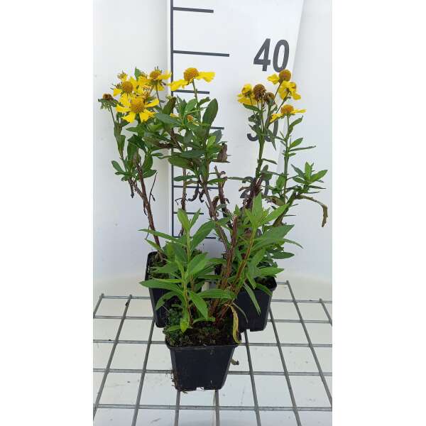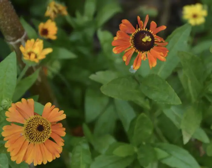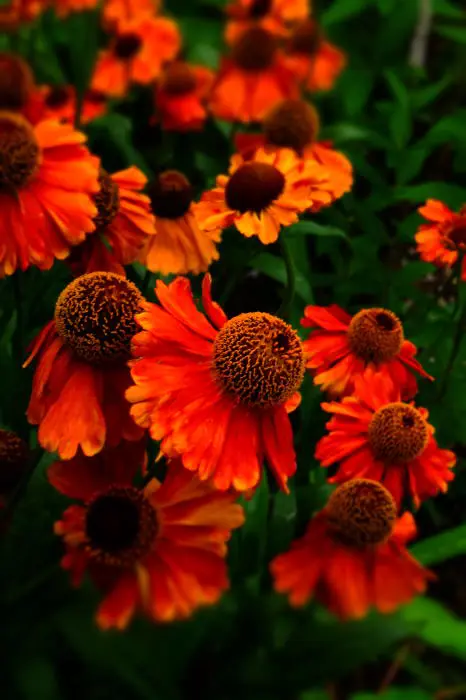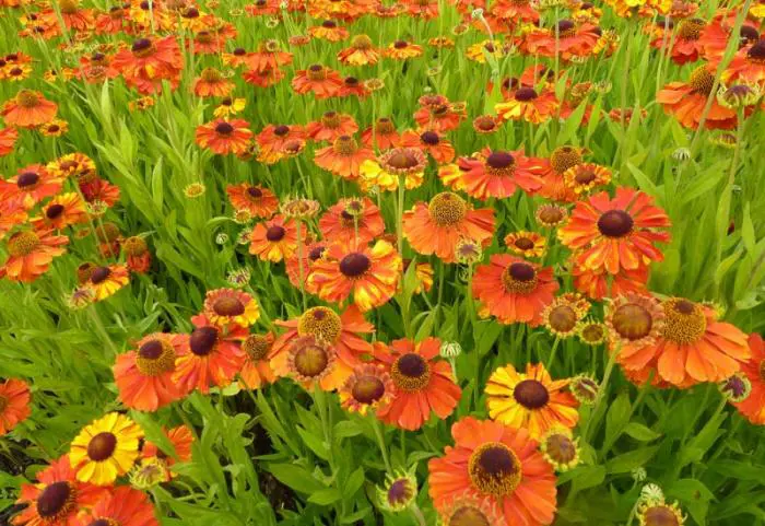 Helenium 'Sahin's Early Flowerer' blüht mit großen Blüten in einer auffälligen Farbe, deren Farbton sich im Laufe des Sommers verändert und unter der Sonne eine Palette aus Gelb, Orange, Rot und Kupfer erzeugt.