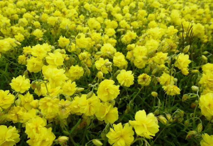 Helianthemum 'Sulphureum Plenum' ist ein Halbstrauch mit graugrünen Blättern und doppelten, leuchtend gelben Blüten,