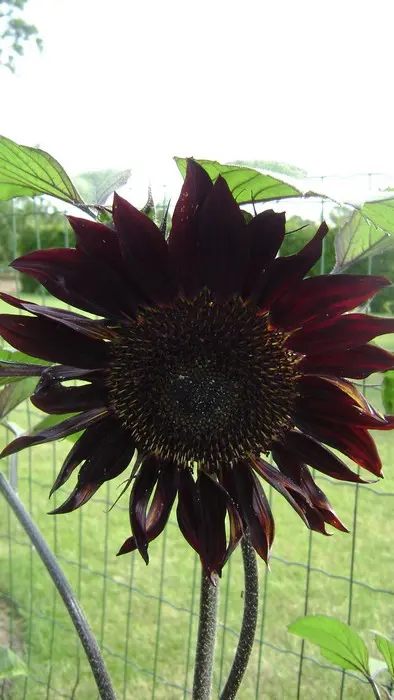 Helianthus annuus 'Moulin Rouge' blüht mit großen, burgunderroten/schwarzroten Blüten.