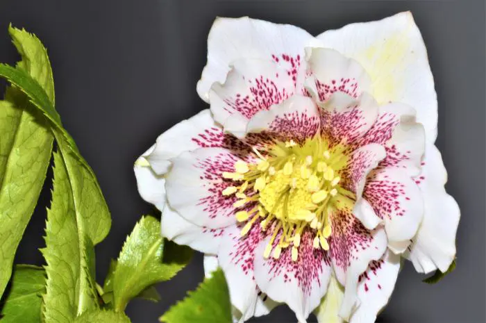 Helleborus × Hybrid, Harvington, doppelt weiß gefleckt, ist eine doppelblütige Niesbrös mit bräunlich-rot gesprenkelten weißen Blüten.
