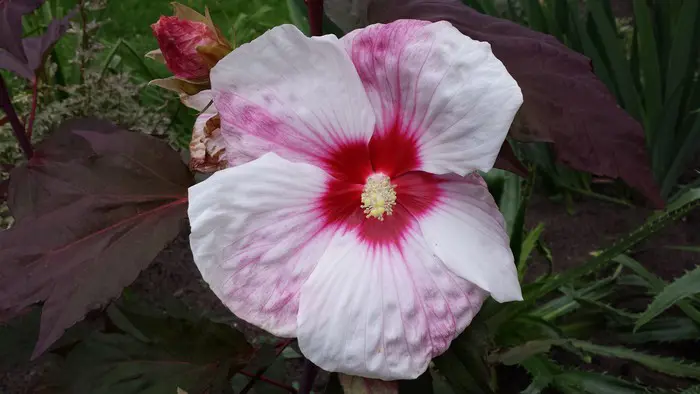 Hibiscus moscheutos 'Kopper King' hat hortensieähnliche Blätter, oben kupferrot und unten orange-rot.