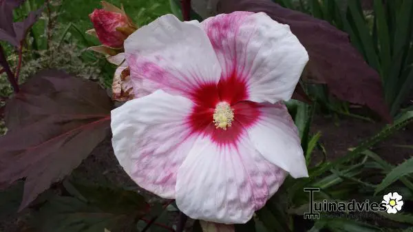 Blüht mit weiß-rosa Blüten und rotem Herz.