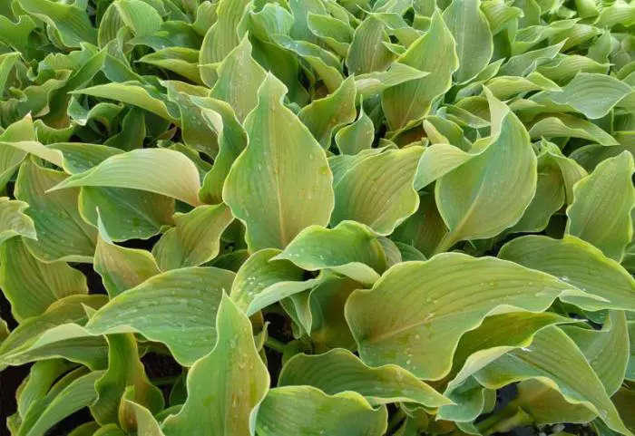 Hosta 'Abba Dabba Do' hat dunkelgrüne Blätter mit welligen Kanten. Sie sind dünn gelb umrandet.
