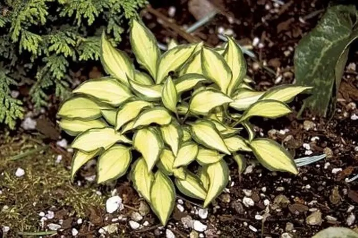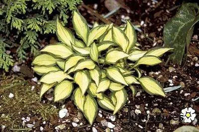 Hosta 'Cat's Eye' ist eine Mini-Hosta des Venustatyps mit kleinen, sanft gelben Blättern und grünem Rand, die mit flieder-violetten Blüten blüht.