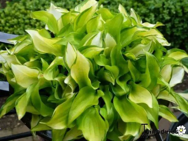 Hosta 'Cracker Crumbs' ist eine Mini-Hosta mit kleinen, glänzenden Blättern, gelb mit grünem Rand.