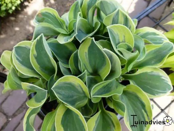 Hosta 'Frosted Mouse Ears' hat blau-grüne Blätter mit einem breiten hellgrünen/cremefarbenen Rand.