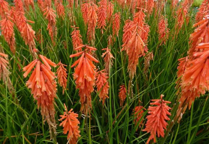 Blüten auf langen, kahlen Blütenstängeln mit spitzenförmigen, dunkelorange-roten Blütenbüscheln.