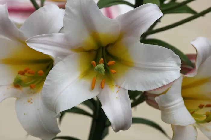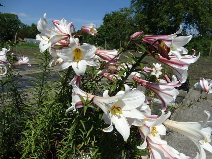 Es handelt sich um weiße Lilien mit hellrosa Flieder außen und gelbem Rachen.