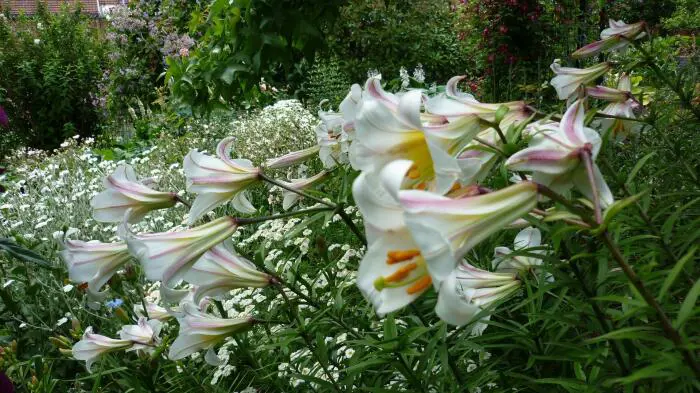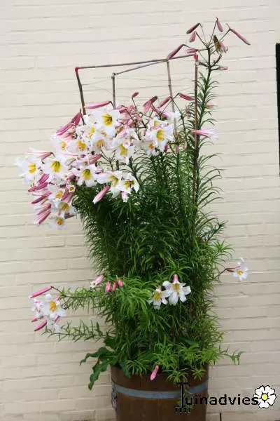 Blüten in Trompetenform, duftend, waagerecht angeordnet.