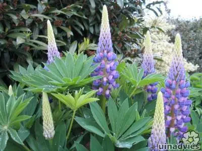 Dieser mehrjährige Lupin bietet große, aufrechte azurblaue Stacheln mit einer weißen Fahne, die den Rändern Vertikalität und einen sehr fröhlichen Touch verleihen. Sie bilden wunderschöne Büschel mit tief geteilten, leuchtend grünen Blättern.